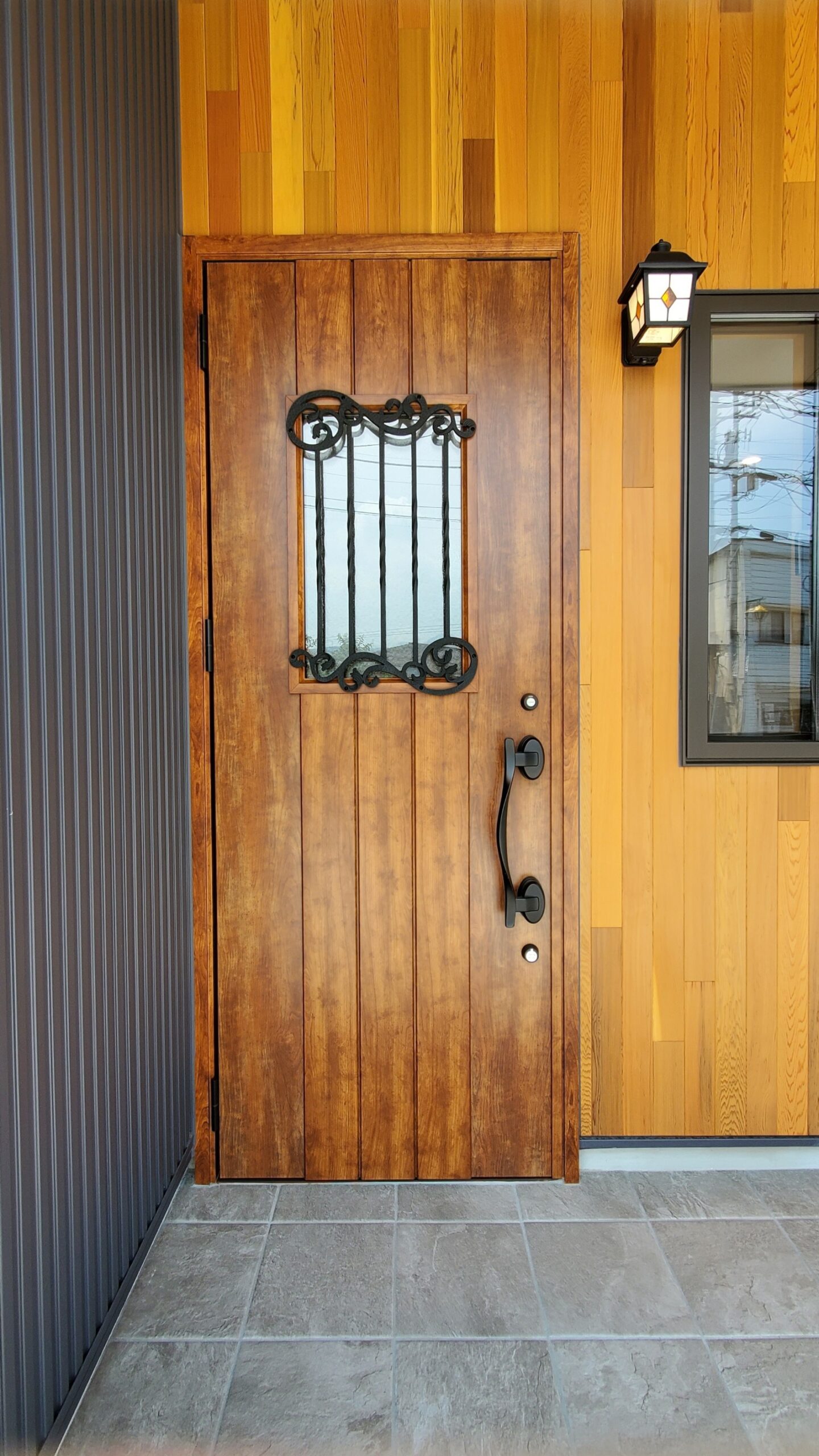 外観は二つの素材(金属系サイディングと米杉)を組み合わせることによって周りとはひとあじ違った雰囲気を出しました。内装は白を基調とし、アクセントとして木目と床は大理石調をあしらいました。